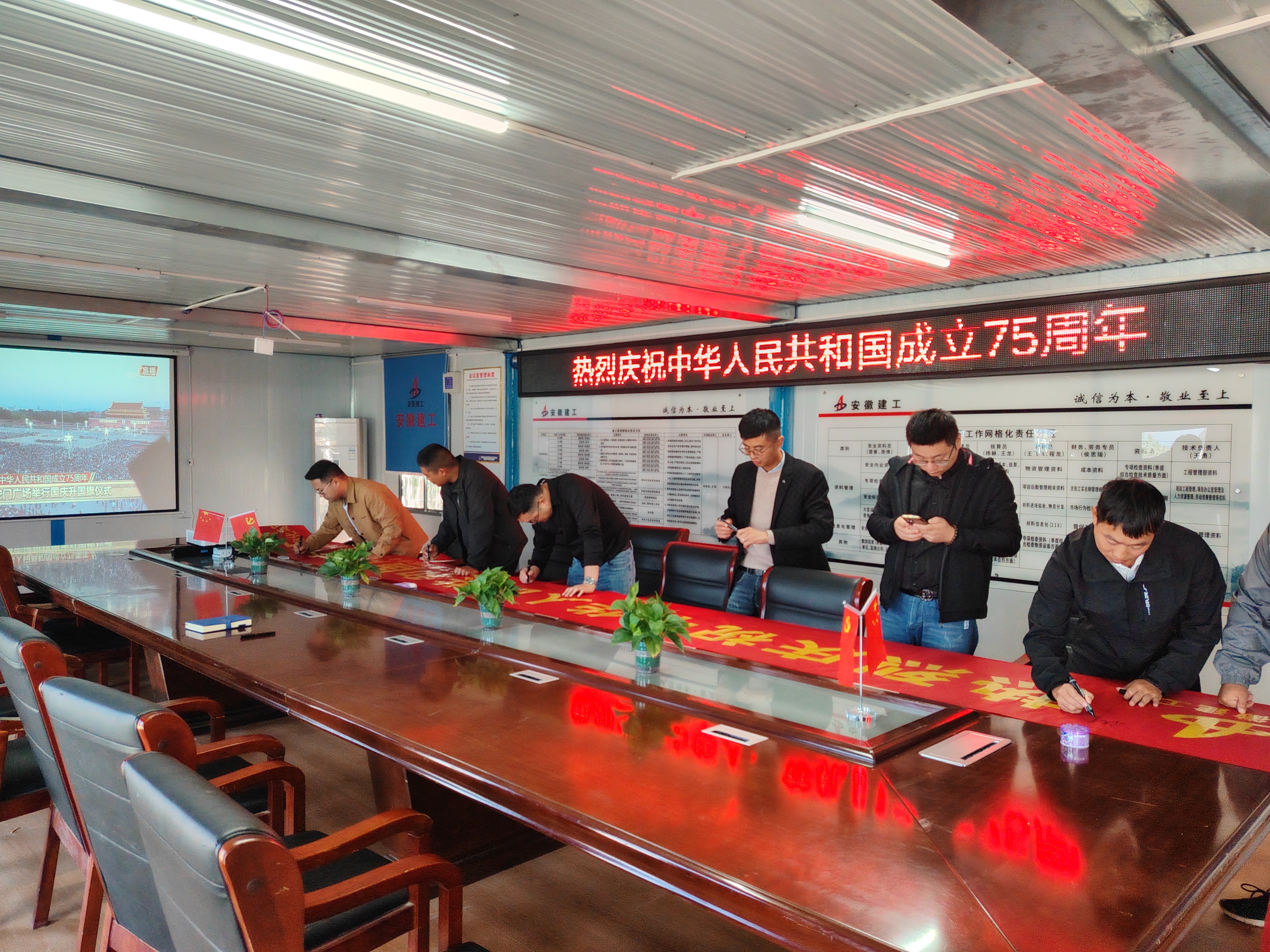 為慶祝中華人民共和國成立75周年,引導(dǎo)項目職工弘揚愛國主義精神,近日,宿徐園區(qū)城鎮(zhèn)一體化AB地塊工程項目部組織開展了“七十五載逢盛世,同心共筑譜華章”系列迎國慶活動,組織職工集中觀看天安門升國旗儀式,在慶祝橫幅上為祖國寫下祝福語,開展“我與國旗合個影”活動。