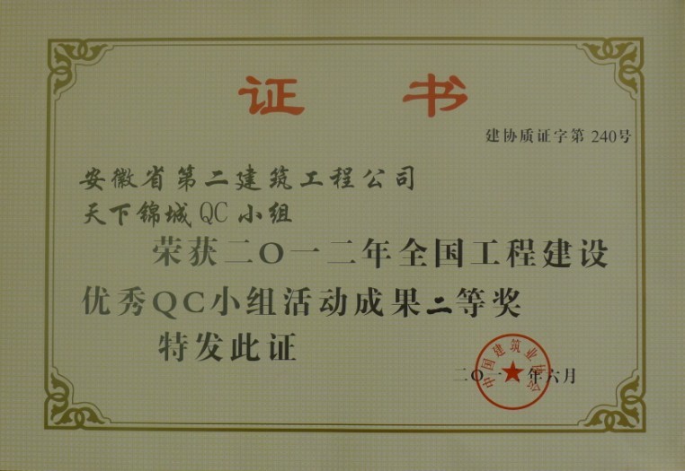 近日,從2012年度全國工程建設優(yōu)秀質量管理(QC)小組評審表彰會上傳來好消息,二公司質量技術處QC小組《提高外墻柔性面磚施工合格率》課題從眾多項目成果中脫穎而出,經(jīng)國家工程建設質量獎審定委員會審定,榮獲中國建筑業(yè)協(xié)會工程建設質量管理分會“2012年度全國工程建設優(yōu)秀QC小組活動成果”二等獎,并獲頒優(yōu)秀成果證書及獎牌。該課題還榮獲安徽省建設工程優(yōu)秀QC小組一等獎。