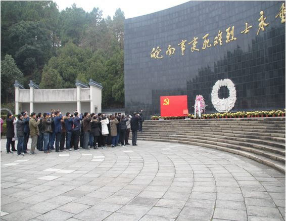 初冬的皖南山區(qū)并無太多蕭瑟之感,目之所及,綿延起伏的群山上仍是郁郁蔥蔥,新四軍軍部舊址就位于這綠水青山之間。黨員同志們懷著敬仰的心情先后參觀了新四軍軍部舊址、新四軍軍部大會(huì)堂舊址、皖南事變烈士陵園,并敬獻(xiàn)花籃與挽聯(lián)。通過講解員的解說,大家了解了新四軍的建立發(fā)展壯大過程、軍部主要機(jī)關(guān)設(shè)置、新四軍將領(lǐng)及女兵的英勇抗日的事跡,以及震驚中外的“皖南事變”的經(jīng)過。豐富而詳實(shí)的館藏史料,讓黨員們重溫了中國共產(chǎn)黨領(lǐng)導(dǎo)中國人民取得革命成功的艱辛歷程;同時(shí)也深刻認(rèn)識到只有在中國共產(chǎn)黨領(lǐng)導(dǎo)下,中國的革命事業(yè)才會(huì)取得不斷勝利。