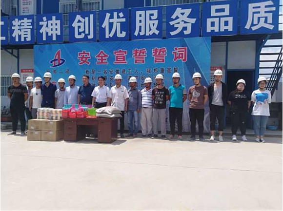 7月21日上午,驕陽似火,酷暑難當(dāng),集團公司工會副主席吳曉伍在公司工會主席李林的陪同下,不畏酷暑來到岳西潤業(yè)電商產(chǎn)業(yè)園開展“送清涼”活動,為奮戰(zhàn)在一線的員工和廣大農(nóng)民工送去了絲絲涼意,獻上了一份誠摯的關(guān)懷。項目經(jīng)理季風(fēng)帶領(lǐng)項目部全體成員迎接集團和公司領(lǐng)導(dǎo)并領(lǐng)取了集團公司為職工發(fā)放的防暑藥品、礦泉水、綠豆、毛巾、洗衣液等防暑降溫物品。