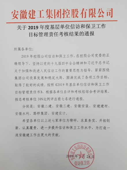 安徽二建公司獲集團(tuán)2019年度信訪保衛(wèi)考核第一名