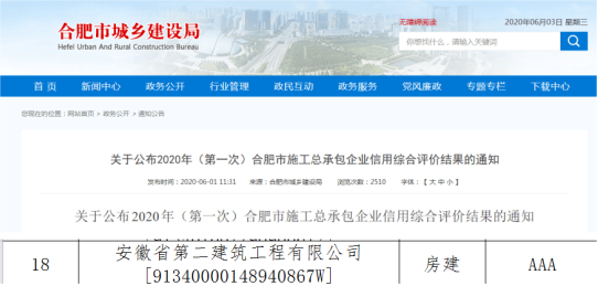 近日,在合肥市城鄉(xiāng)建設(shè)局網(wǎng)站關(guān)于公布2020年(第一次)合肥市施工總承包企業(yè)信用綜合評(píng)價(jià)結(jié)果的通知中,安徽二建公司在房建專業(yè)信用綜合評(píng)價(jià)獲得AAA級(jí)信用企業(yè),在454家參評(píng)企業(yè)中總排名第18名,市政專業(yè)信用綜合評(píng)價(jià)獲得AA級(jí)信用企業(yè),在331家參評(píng)企業(yè)中總排名第27名。此次合肥市施工總承包企業(yè)信用綜合評(píng)價(jià)準(zhǔn)備工作,由公司市場管理部牽頭,相關(guān)部門及所屬各單位配合,歷時(shí)一年時(shí)間。房建專業(yè)AAA級(jí)信用企業(yè)的獲得,有助于公司在合肥市場的公開招投標(biāo)。