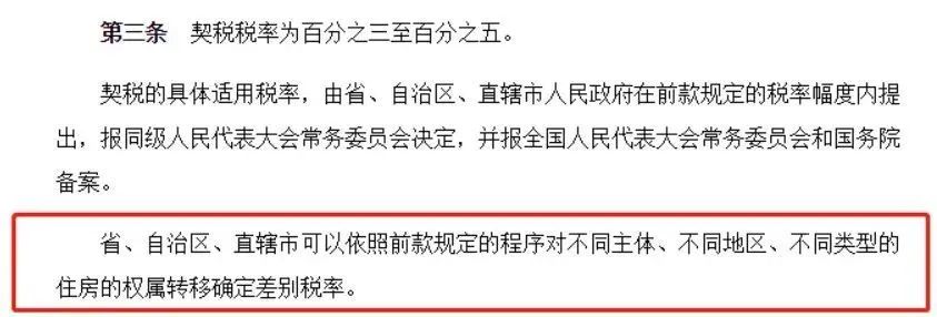 其實(shí),1997年發(fā)布的《中華人民共和國契稅暫行條例》中,早已規(guī)定契稅稅率為百分之三至百分之五。但各省市可以根據(jù)實(shí)際情況確定差別稅率。