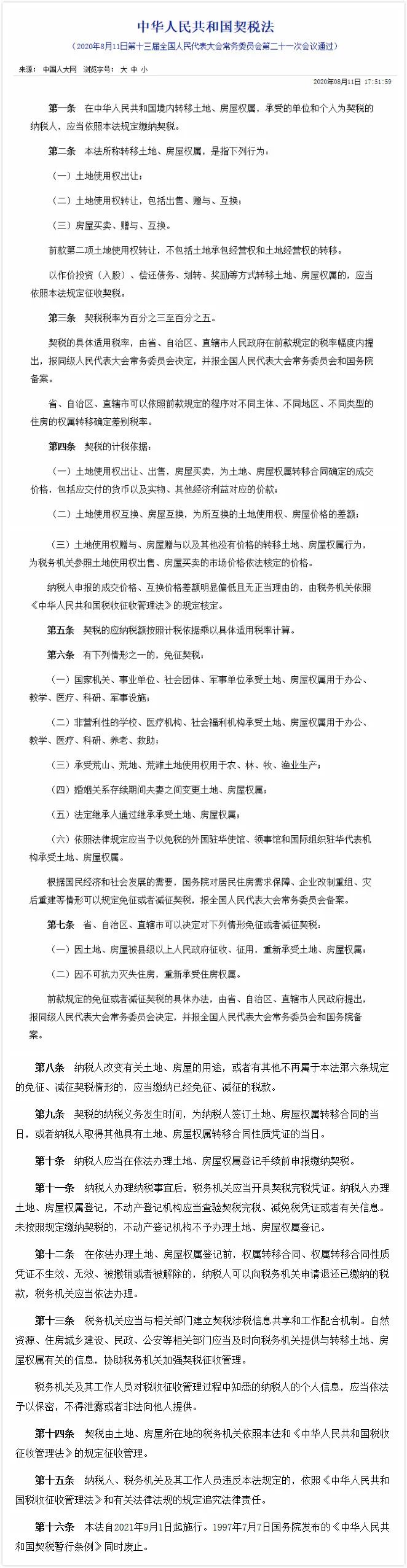 與房屋買賣相關(guān)的《中華人民共和國契稅法》(以下簡稱《契稅法》)在8月11日的第十三屆全國人民代表大會(huì)常務(wù)委員會(huì)第二十一次會(huì)議通過,并將于2021年9月1日起施行。