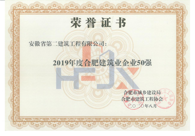 安徽二建公司榮獲“2019年度合肥市50強(qiáng)建筑業(yè)企業(yè)”等榮譽(yù)