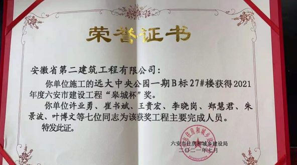 近期,六安市住房和城鄉(xiāng)建設(shè)局公布了2021年度六安市建設(shè)工程“皋城杯”獲獎(jiǎng)項(xiàng)目名單,其中由安徽二建公司承建的舒城遠(yuǎn)大項(xiàng)目獲此獎(jiǎng)項(xiàng)。