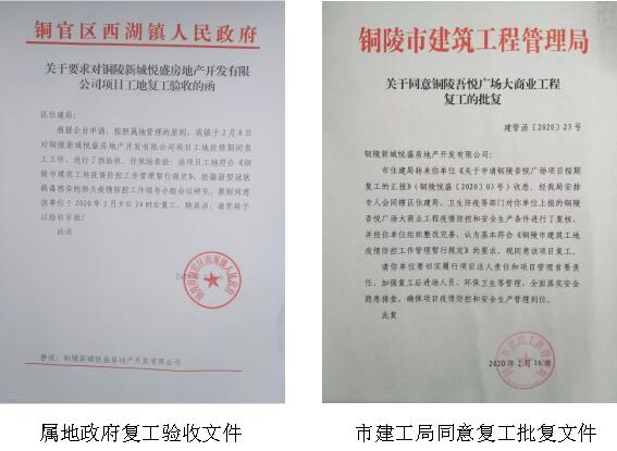 2月12日,銅陵市住建局安排專人會同銅官區(qū)住建、衛(wèi)生防疫等部門,對項目部疫情防控及安全生產(chǎn)條件進行復核,認為基本符合《銅陵市建筑工地疫情防控工作管理暫行規(guī)定》的要求。2月17日,銅陵市住建局下發(fā)《關(guān)于同意銅陵吾悅廣場大商業(yè)工程復工的批復》,同時提出要加強復工后進場人員環(huán)保衛(wèi)生管理,全面落實安全隱患排查,確保項目疫情防控和安全生產(chǎn)管理到位。
