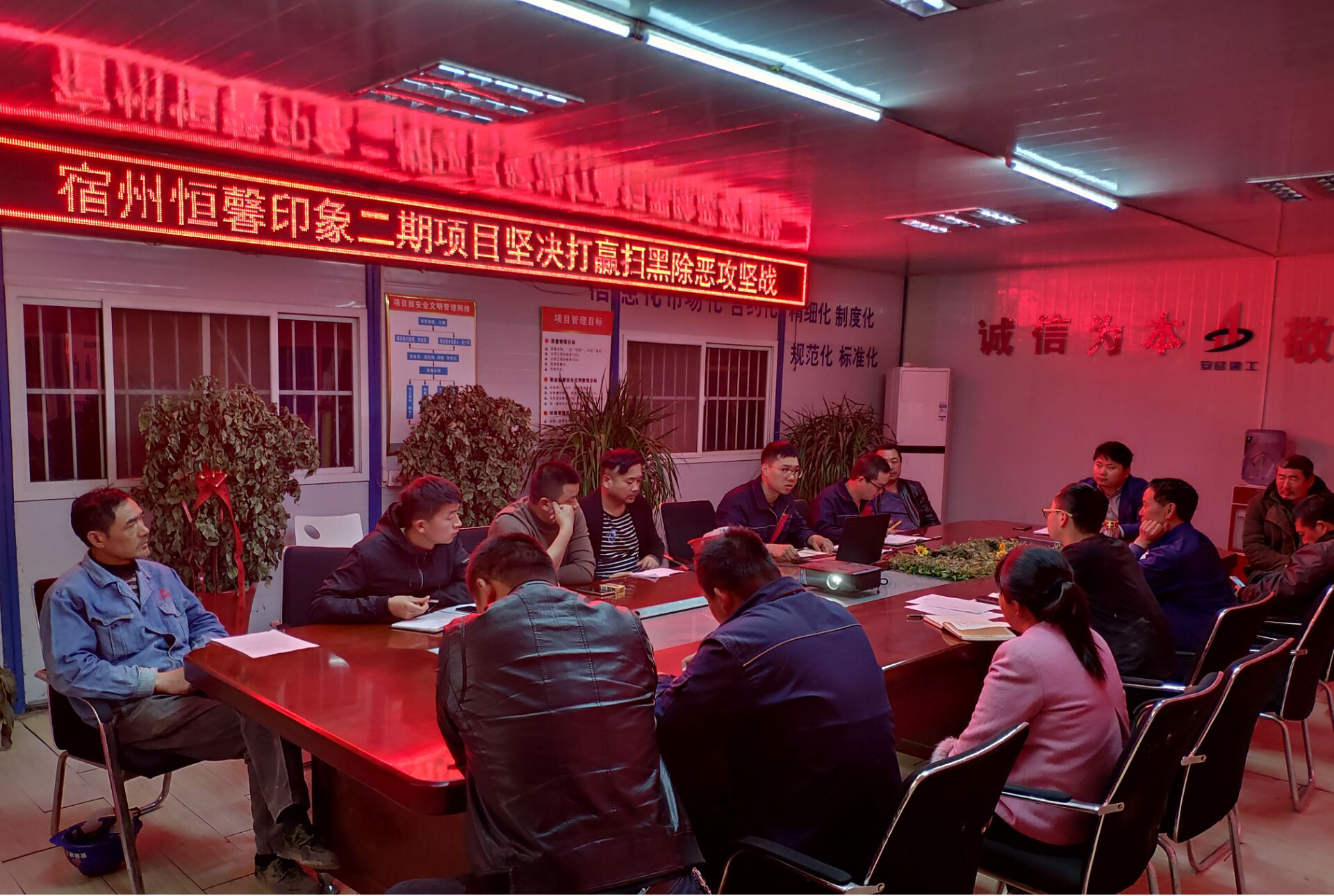 根據(jù)公司下發(fā)的關(guān)于掃黑除惡專項(xiàng)治理行動(dòng)的通知要求,宿州恒馨印象二期項(xiàng)目于2019年4月15日下午利用生產(chǎn)調(diào)度會(huì)召開掃黑除惡專題會(huì)議,進(jìn)行了工作部署,成立了“掃黑除惡工作領(lǐng)導(dǎo)小組”。小組辦公室設(shè)在安全科,項(xiàng)目經(jīng)理任組長,技術(shù)負(fù)責(zé)人、生產(chǎn)經(jīng)理任副組長,各科室負(fù)責(zé)人為成員,切實(shí)形成掃黑除惡整體工作合力。項(xiàng)目部通過懸掛橫幅、led電子顯示屏、各樓棟張貼通告、微信群發(fā)等多種方式向施工現(xiàn)場人員宣傳掃黑除惡專項(xiàng)斗爭的參與方式和獎(jiǎng)勵(lì)規(guī)定,有效提升了掃黑除惡效果,為正常的安全生產(chǎn)保駕護(hù)航。