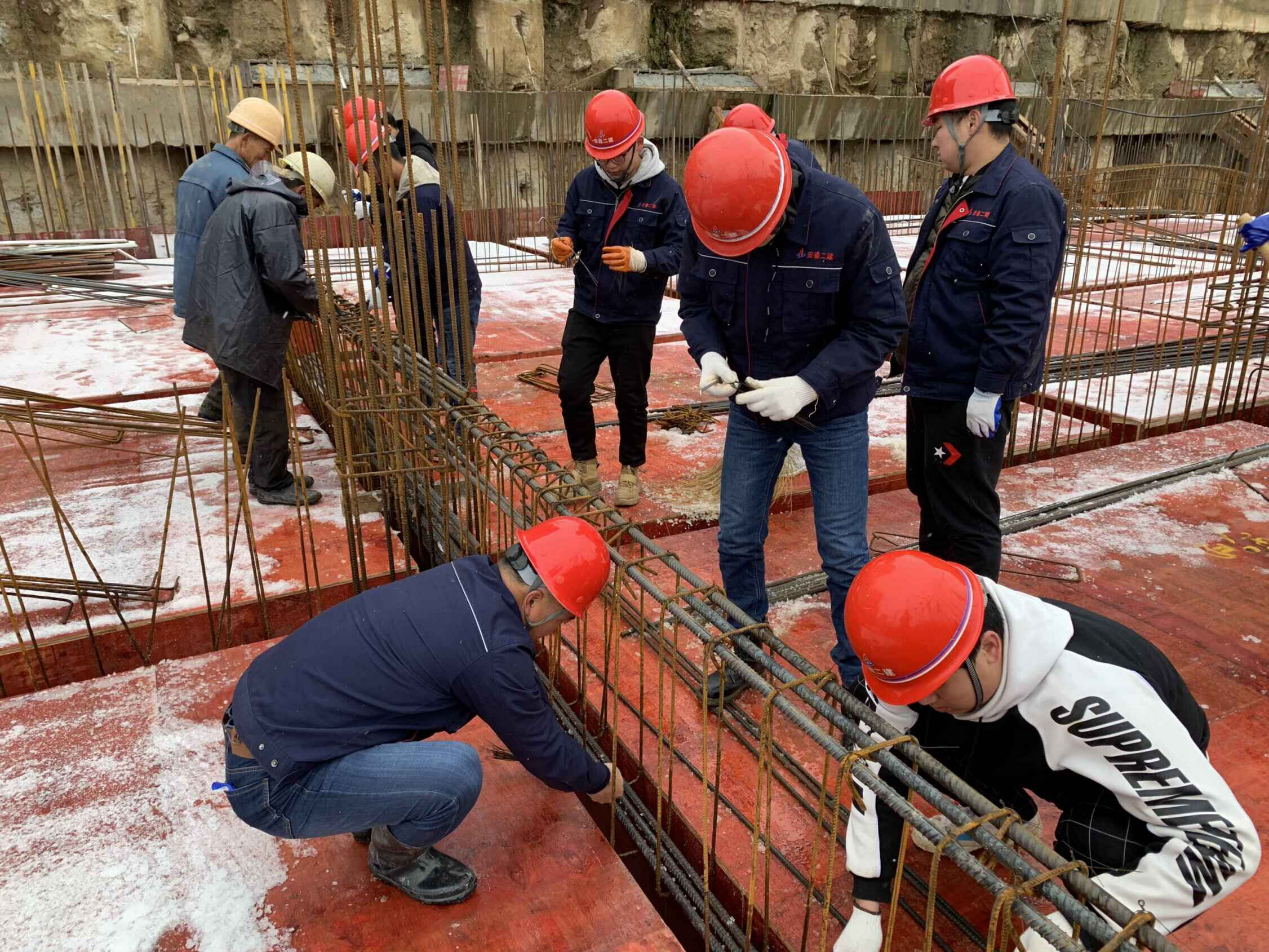 8日,大雪紛紛揚揚下了一天,為更好的激勵各班組保安全、促生產(chǎn)。在項目黨支部和共青團的帶領(lǐng)下,管理人員與班組工人一同綁扎鋼筋。雖然雪花飛舞,寒風刺骨,但大家無一人退縮,綁扎鋼筋超過了工人擺放鋼筋的速度。