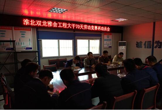 自十月初公司開展“大干70天”勞動競賽活動以來,淮北雙龍雅舍項目在項目經(jīng)理盧因東的帶領下積極響應公司號召,合理安排工作計劃,精心組織施工部署,全面掀起大干熱潮。會上,崔書斌經(jīng)理要求項目部繼續(xù)保持高昂的工作熱情,倒排施工計劃,抓住關鍵節(jié)點。蒯家江宣貫了公司勞動競賽活動精神,指示項目部落實 “比、學、趕、幫、超”活動方式,提高認識,端正態(tài)度。強調(diào)年輕管理人員要加強自身學習,提高工作執(zhí)行力,養(yǎng)成良好的工作習慣;同時也要有面對挫折的勇氣,做到干一行愛一行,同心協(xié)力為二建的發(fā)展貢獻一份力量。