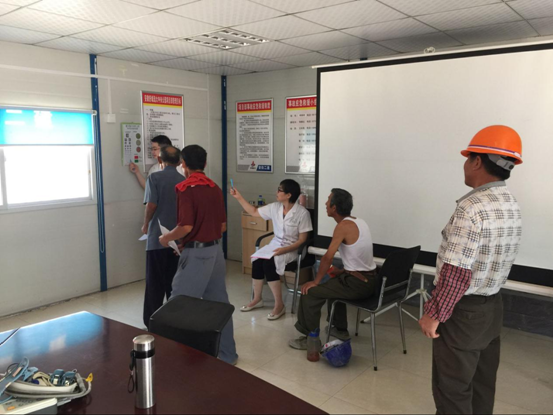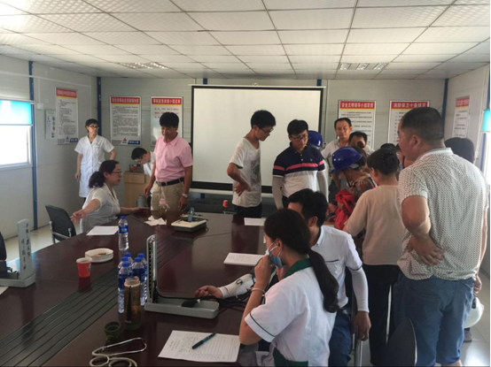在會議室,工人們有序地排隊進行各項檢查,并不時提出各種健康疑問,醫(yī)生耐心的解答并指出夏季作業(yè)的注意事項。隨后,體檢結(jié)果由項目管理人員分發(fā)到工人手里,活動順利結(jié)束。