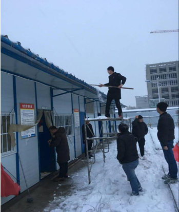 大伙兒冒著寒風,紛紛拿著鐵鍬、掃帚等打掃工具趕赴掃雪現(xiàn)場,相互配合、齊心協(xié)力,你鏟我掃,一點點地將積雪鏟起集中堆放,一派熱火朝天的景象。經(jīng)過一個多小時的奮戰(zhàn),項目部施工現(xiàn)場主要通道和項目部院子、生活區(qū)等地的積雪全部鏟除,看著清理干凈的路面,大家洋溢著開心的笑容。