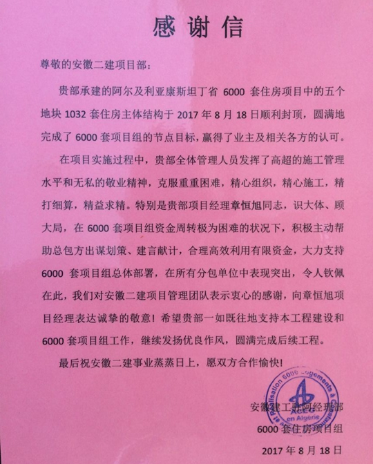 康斯坦丁6000套工程項(xiàng)目是由安徽建工集團(tuán)獨(dú)立總承包的項(xiàng)目,安徽二建公司承擔(dān)1032套施工任務(wù),建筑面積10萬(wàn)平米,合同額2.5億人民幣,此次結(jié)構(gòu)封頂?shù)氖瞧渲形鍌€(gè)地塊1032套住房。項(xiàng)目部在施工過(guò)程中,克服重重困難,科學(xué)制定施工方案,合理調(diào)配人員設(shè)備,精心組織,精細(xì)施工,抓管控保優(yōu)質(zhì),始終秉持“建精品、創(chuàng)一流”的建設(shè)目標(biāo),將工程質(zhì)量放在第一位。在項(xiàng)目部全體參建員工的努力下,康斯坦丁6000套項(xiàng)目的建設(shè)獲得了業(yè)主及相關(guān)各方的好評(píng)。安徽建工駐阿經(jīng)理部6000套項(xiàng)目組在感謝信中充分肯定了項(xiàng)目部的建設(shè)成果,高度贊揚(yáng)安徽二建項(xiàng)目部高效的管理水平和無(wú)私的敬業(yè)精神,并特別對(duì)安徽二建項(xiàng)目經(jīng)理章恒旭同志識(shí)大體、顧大局的工作作風(fēng)以及積極主動(dòng)、建言獻(xiàn)策的工作態(tài)度表示感謝。在信的結(jié)尾,6000套項(xiàng)目組對(duì)今后的合作也提出了期許,希望能夠攜手并進(jìn),共創(chuàng)未來(lái)。