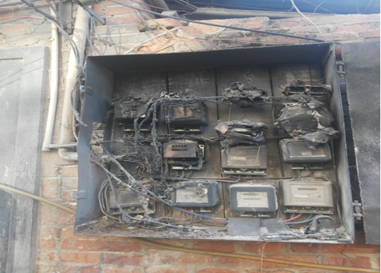 7月21日清晨5點,后勤綜合服務(wù)部物管辦接到原二分公司生活基地管理員緊急電話,生活區(qū)平3棟電表箱因持續(xù)高溫用電負荷增大,線路老化嚴重造成電表自燃,表箱整體燒毀。由于消防器材的配備完善,平時對居民防火意識的宣傳到位,撲救及時,未造成重大火災(zāi)及財產(chǎn)損失。接到電話后,后勤物管辦立即安排專業(yè)技術(shù)人員趕赴現(xiàn)場,對事故現(xiàn)場進行全面的排查檢修,在不影響整個小區(qū)居民正常用電的情況下,首先斷開這一棟平房主電源解除安全隱患,在本著以最快速度解決問題和節(jié)約成本的前提下,對現(xiàn)場進行了梳理,就地制定解決施工方案并及時匯報領(lǐng)導實施操作。