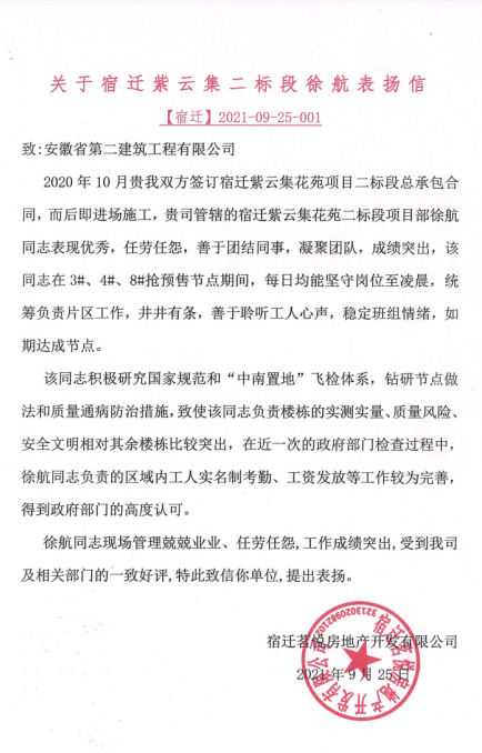 近日,第三分公司宿遷中南紫云集花苑項(xiàng)目的施工員徐航收到了一封業(yè)主單位發(fā)來(lái)的表?yè)P(yáng)信,平日大方灑脫的他在收到信后露出了靦腆的笑容,他表示:“這是自己的分內(nèi)工作,以后會(huì)繼續(xù)保持”。平日里的徐航工作責(zé)任心強(qiáng),在項(xiàng)目3#、4#、8#搶收節(jié)點(diǎn)期間,兢兢業(yè)業(yè)堅(jiān)守崗位,每日加班加點(diǎn)至凌晨,在他和所在片區(qū)工人的努力下,項(xiàng)目如期完成節(jié)點(diǎn)任務(wù)。針對(duì)項(xiàng)目現(xiàn)場(chǎng)工作總是親歷親為,在面對(duì)裝配式項(xiàng)目的施工難點(diǎn)、重點(diǎn)工作時(shí),通過(guò)對(duì)專業(yè)書籍的學(xué)習(xí),不斷攻堅(jiān)克難,提高能力,增強(qiáng)技能。他負(fù)責(zé)的片區(qū)在質(zhì)量風(fēng)險(xiǎn)、勞務(wù)實(shí)名制等方面工作明顯優(yōu)于其他樓棟的工作,在業(yè)主方“飛檢”、政府檢查中得到高度認(rèn)可。